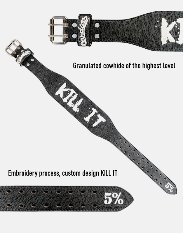 Дизайн пояса - это смелое заявление о вашей целеустремленности. Надпись «KILL IT», выполненная методом вышивки, придает поясу индивидуальность. На конце пояса также вышито «5%», демонстрирующее ваше стремление к совершенству.