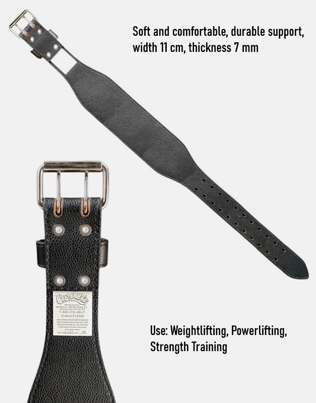 Размеры пояса: толщина - 7 мм, ширина поясничной панели - 11 см. Пояс идеально подходит для приседаний, становой тяги, жимов и других силовых тренировок.