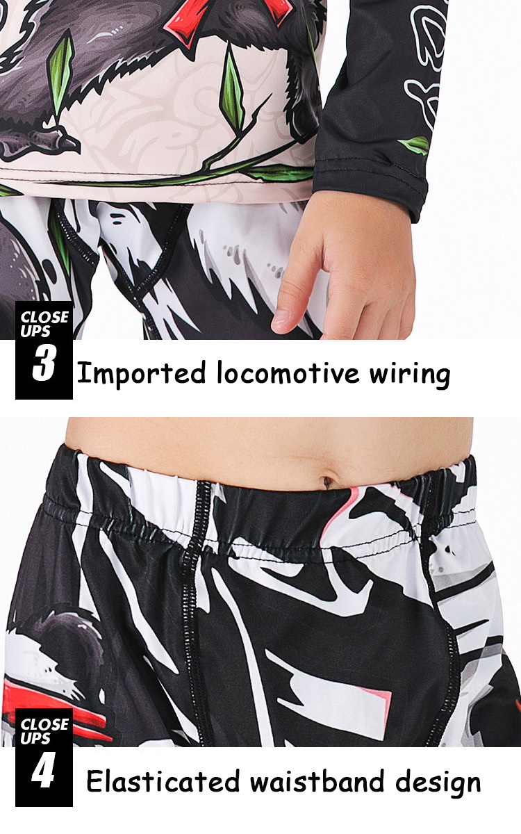 Детали: этот детский костюм сделан из эластичного материала, отводит влагу, обеспечивает всестороннюю защиту от бактерий и ссадин. Модель имеет плоские швы, они не натирают тело и обеспечивают нужный комфорт. Качественный принт выполнен методом сублимации.