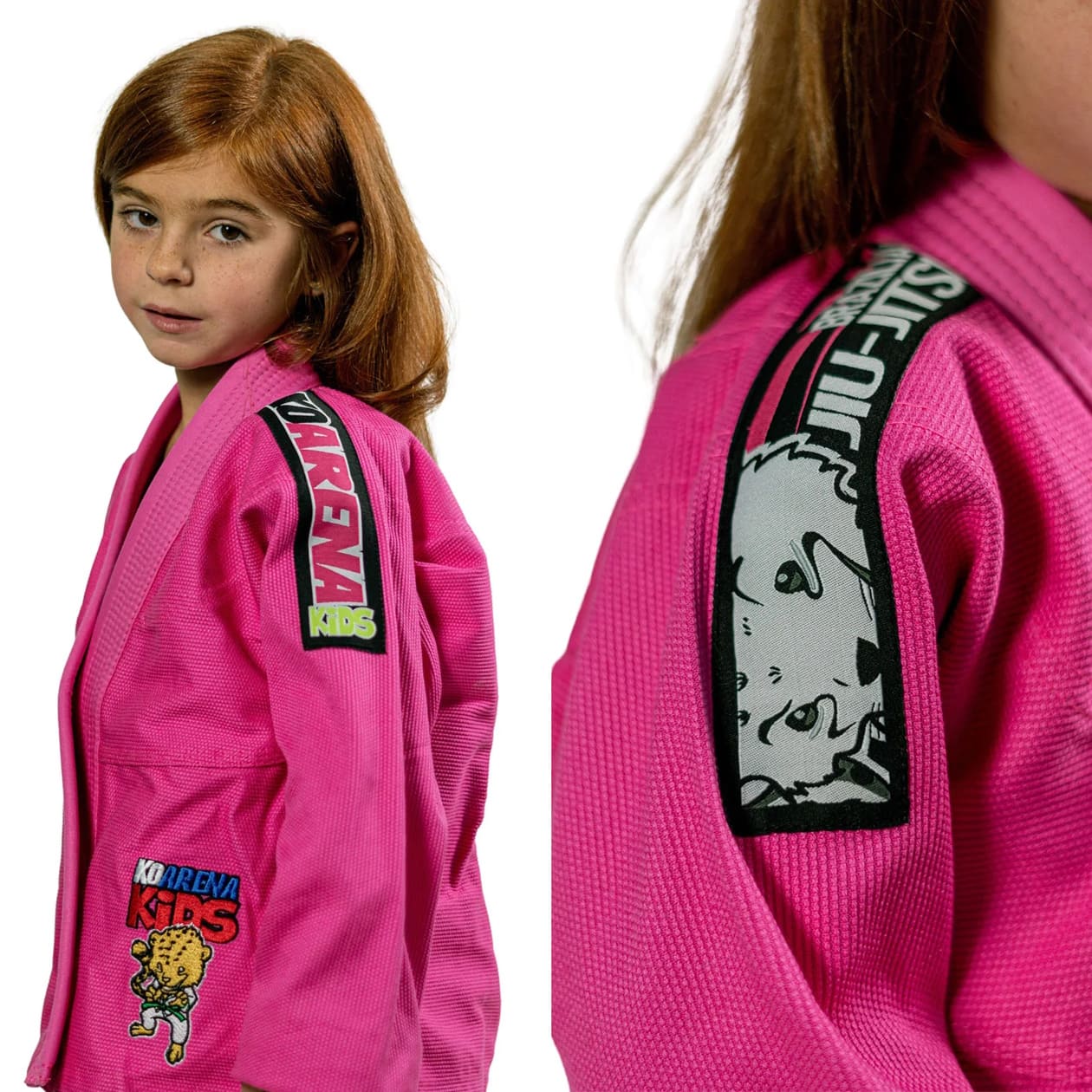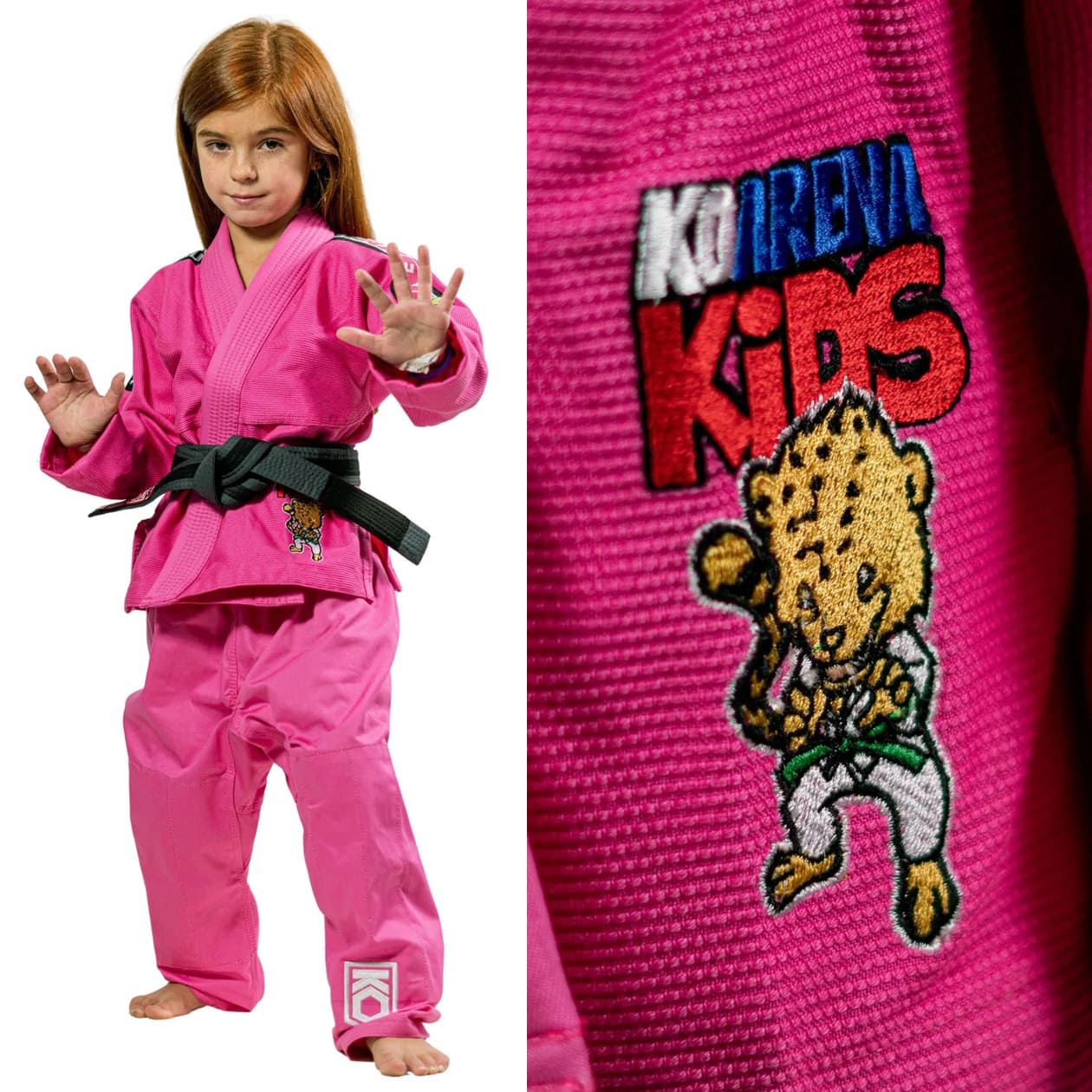 Куртка изготовлена из 100% хлопка жемчужного плетения. Эта ткань очень однородна, и в отличие от других брендов, куртка этого кимоно для ребенка полностью сделана из той же ткани, которая используется для взрослых ги. Дизайна куртки имеет нашивку на каждом плече, а на нижней передней части вышивка с талисманом Читой, дружелюбным детенышем гепарда.