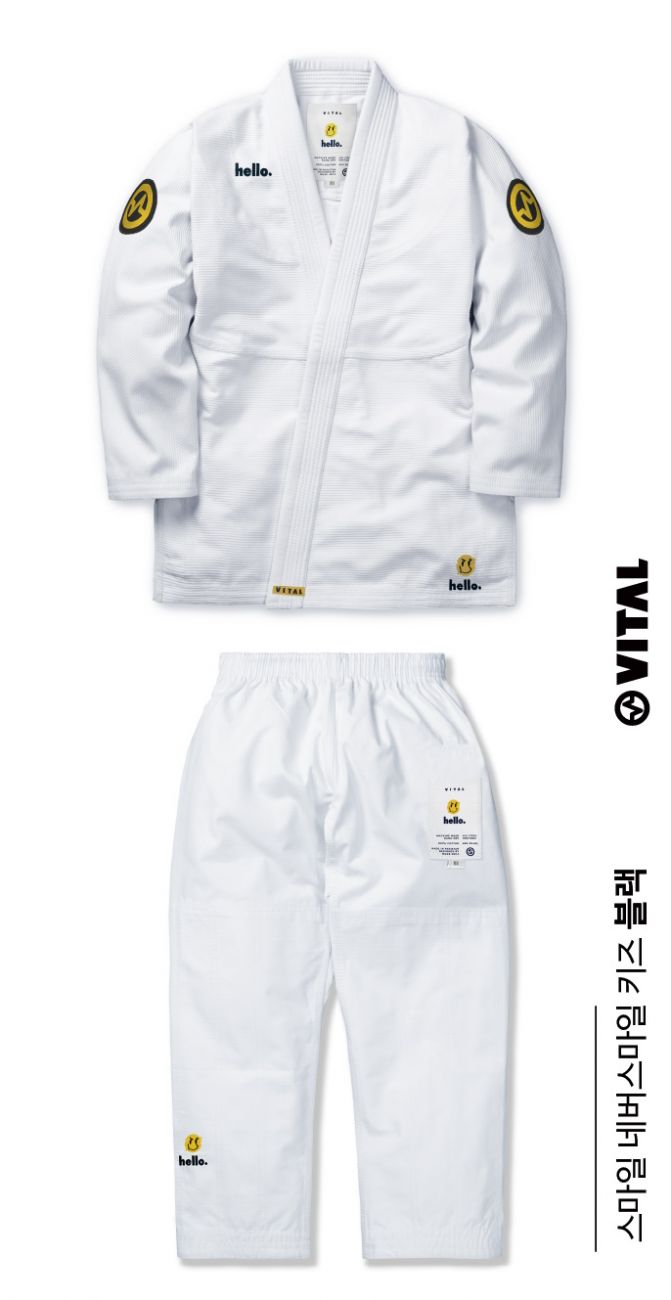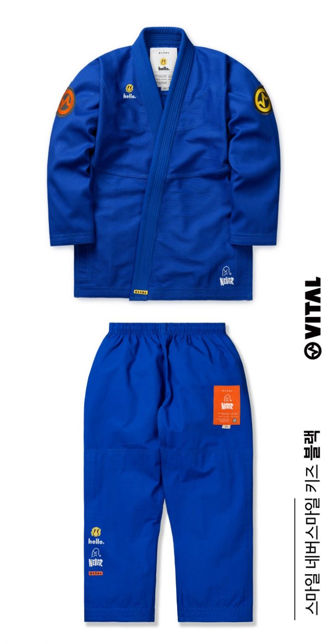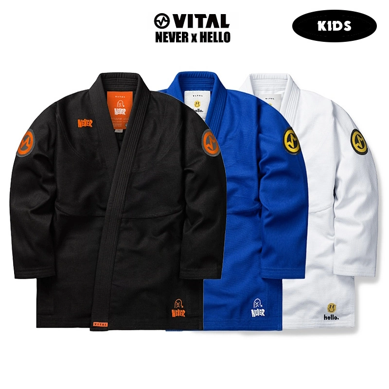 Кимоно Vital "Never x Hello" имеет базовый дизайн, усилено во всех стрессовых точках. Куртка выплнена из 100% хлопка, имеет абсорбирующий пот воротник EVA. Штаны сделаны из рип-стопа 285GSM с двойными коленями, пояс на резинке с внутренним шнурком для надежной фиксации.