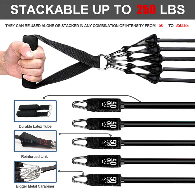 Эластичные стропы "трубки" изготовлены из 100% латекса, каждая стропа имеет нагрузку сопротивления в 22,7 кг. Минимальная нагрузка в упражнениях - 22,7 кг / максимальная - 113 кг.