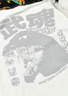 Внутренняя часть куртки украшена уникальным принтом в стиле ирезуми, нанесенным методом сублимации. Со временем этот принт выцветет, придав кимоно неподвластный времени винтажный вид.