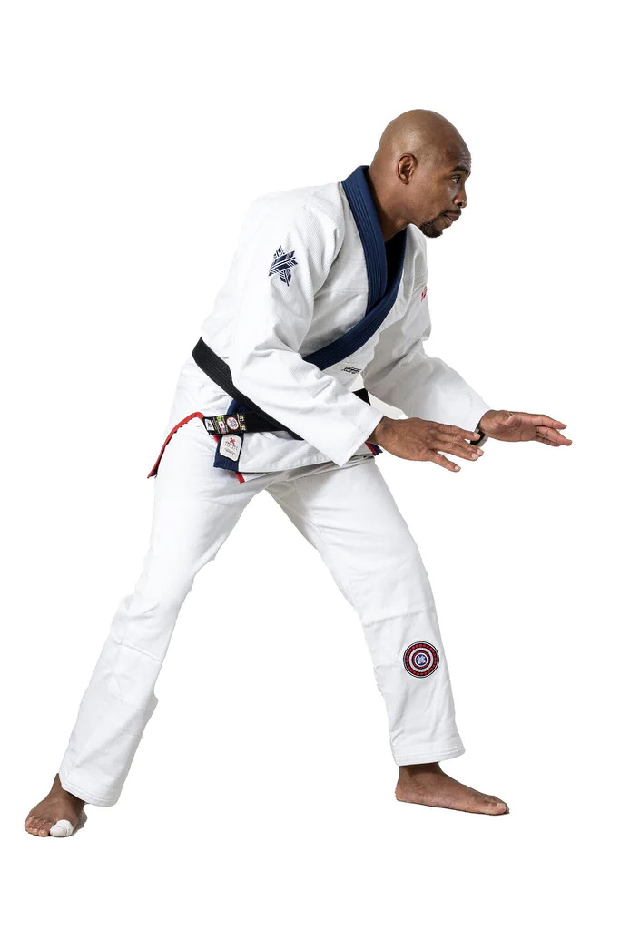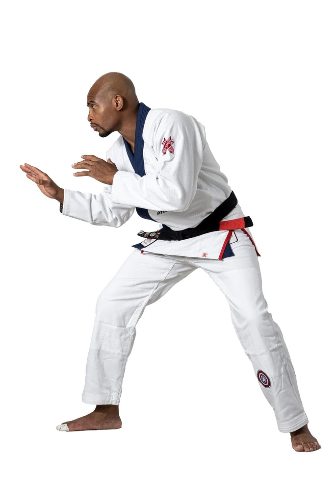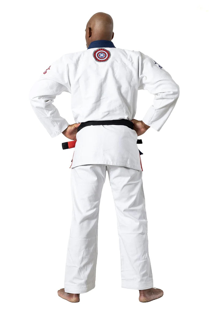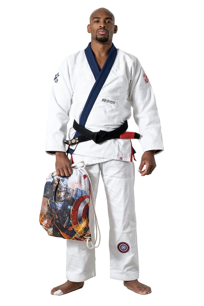 Это белое ги с синим лацканом украшено фирменной вышивкой, усилено тройными швами, имеет предварительную усадку. Прочная куртка из мягкого хлопка высшего качества имеет антибактериальный воротник EVA. Внутренняя подкладка из сетчатого материала с графикой "суперсолдата" выполненной методом сублимации. Штаны из плотного хлопка с двойными коленями, эластичная веревка для надежной фиксации. В комплекте фирменный мешок для хранения и транспортировки.