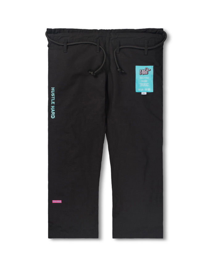 Модель "Humble & Hustle" имеет базовай дизайн в конрастном стиле, усилено во всех стрессовых точках. Куртка из высококачественного хлопка средней плотности. Брюки из легкого и прочного рип-стопа с двойными коленями. Эластичная веревка на 4 петлях обеспечивает надежную фиксацию.