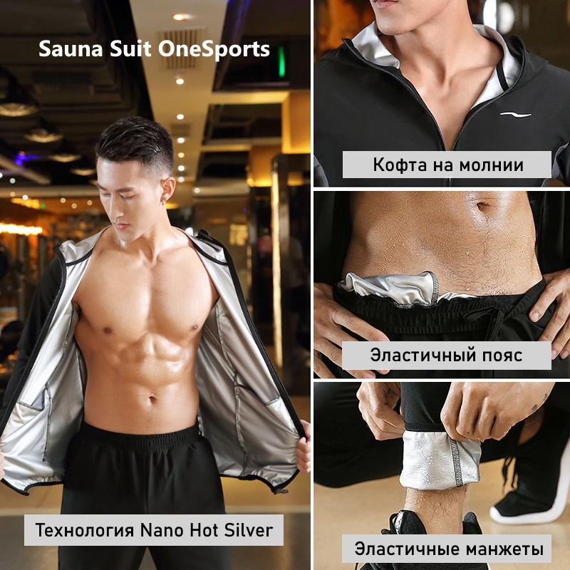 Костюм с капюшоном, сделан из 100% полиэстера с внутренним теплоотражающим слоем "NANO HOT SILVER". Используя нанотехнологии и принцип физического теплового цикла, костюм-сауна ONESPORTS, также является водонепроницаемым и ветрозащитным - протестирован, имеет высокие отзывы.