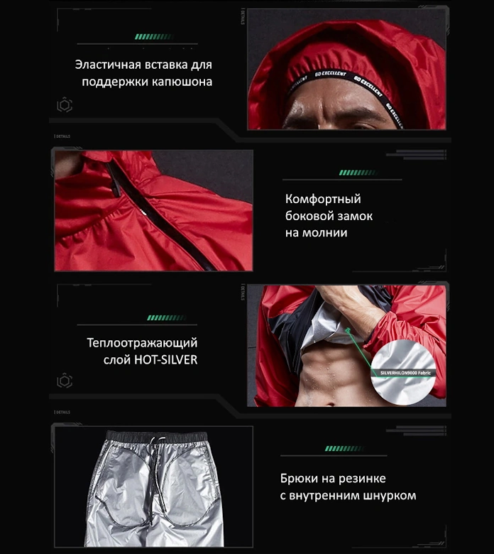 Костюм выполнен из износостойкой синтетической ткани с водоотталкивающими свойствами, имеет внутренний слой "Hot Silver", который обеспечивает тепловой эффект. Куртка на косом замке с регулируемым капюшоном для усиления эффекта, на штанах присутствуют боковые карманы. Эластичные манжеты на поясе, руках и лодыжках сохраняют внутреннее тепло и дают больший "эффект сауны".