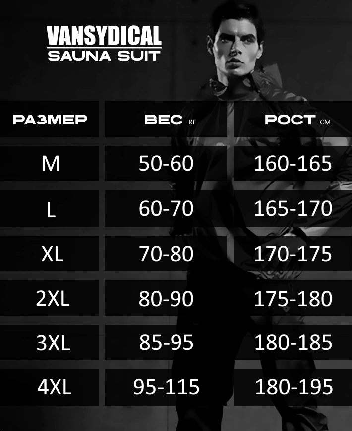 - Костюм-сауна Vansydical выполнен из износостойкой синтетической ткани с водоотталкивающими свойствами. Внутренняя часть костюма снабжена слоем "Hot Silver", который обеспечивает тепловой эффект.