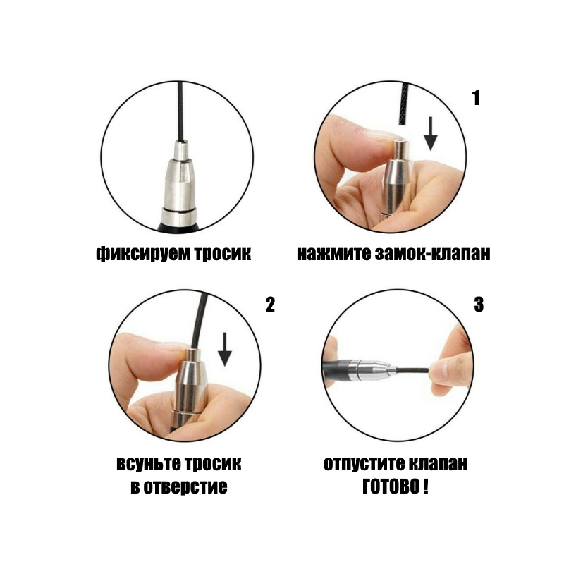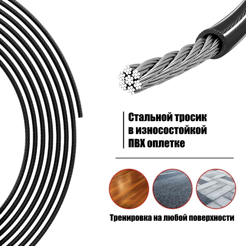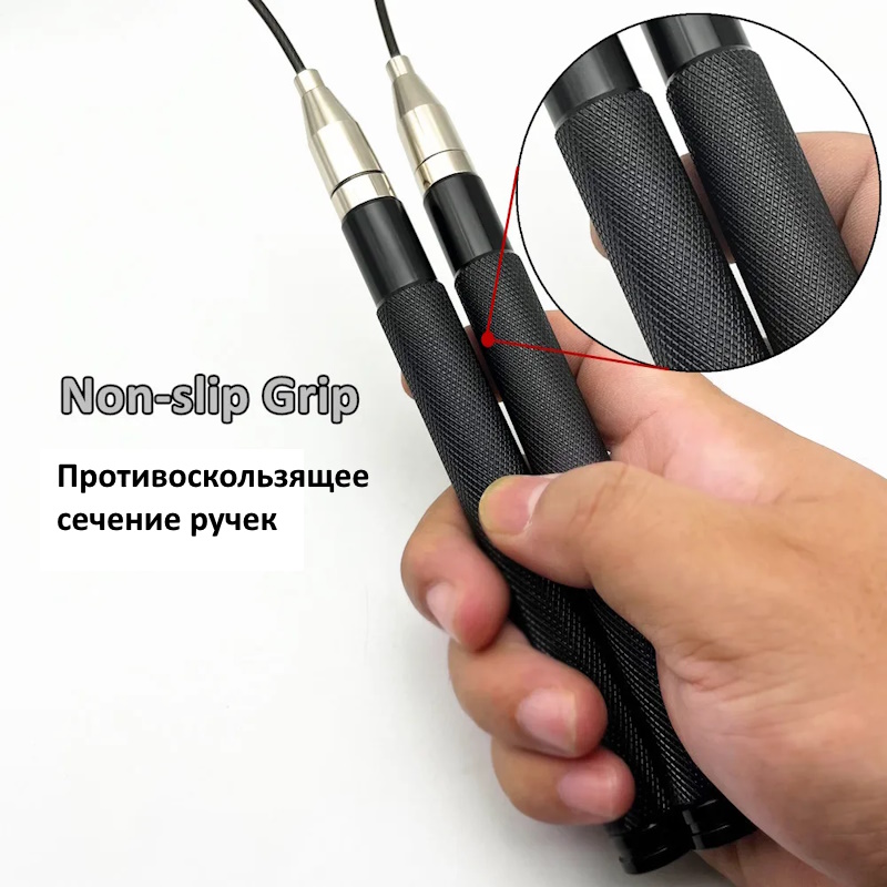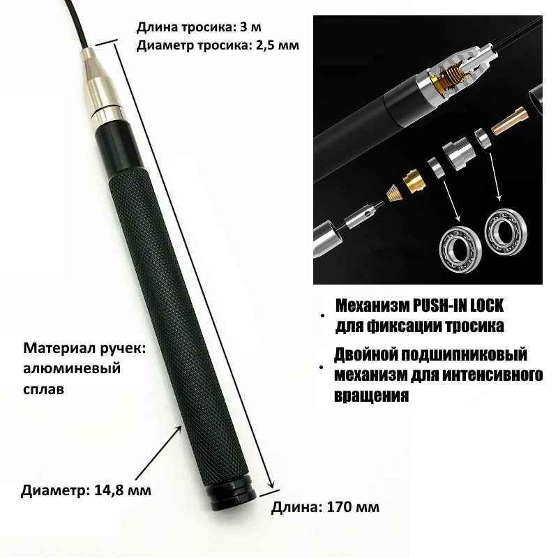 Ручки из алюминия с сечением Non-Slip Grip, длиной 170 мм. В комплекте стальной тросик длиной 300 см в износостойкой пвх оплетке. Система самоблокирующего замка-клапана PUSH-IN LOCK помогает регулировать тросик с мгновенной фиксацией в ручках. Скакалка оснащена подшипниковым механизмом для качественного и комфортного тренинга. Он предотвращает блокировку, стабилизирует тросик и обеспечивает высокую скорость вращения на 360 градусов.