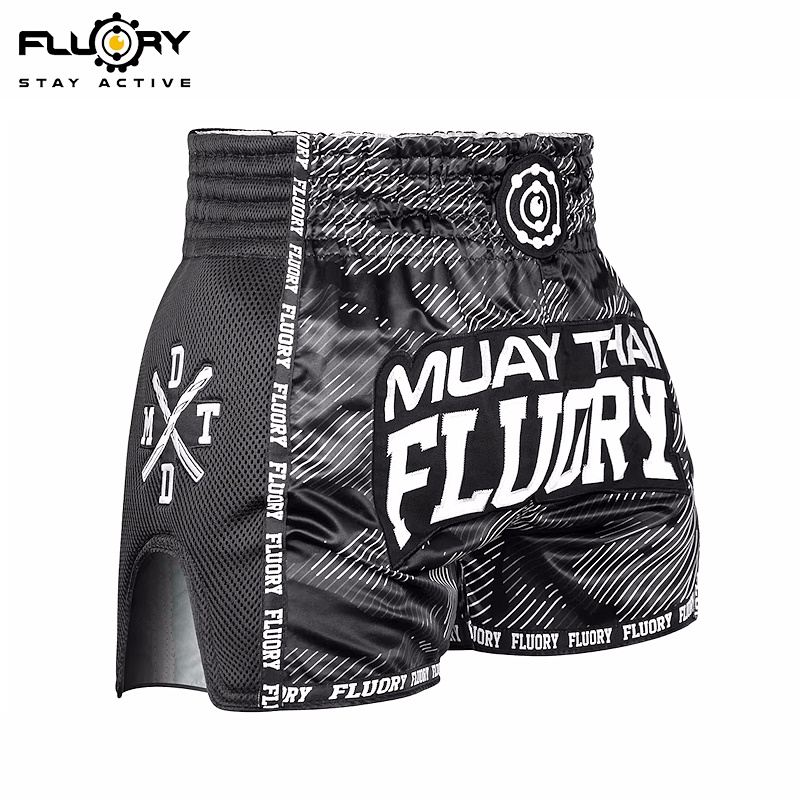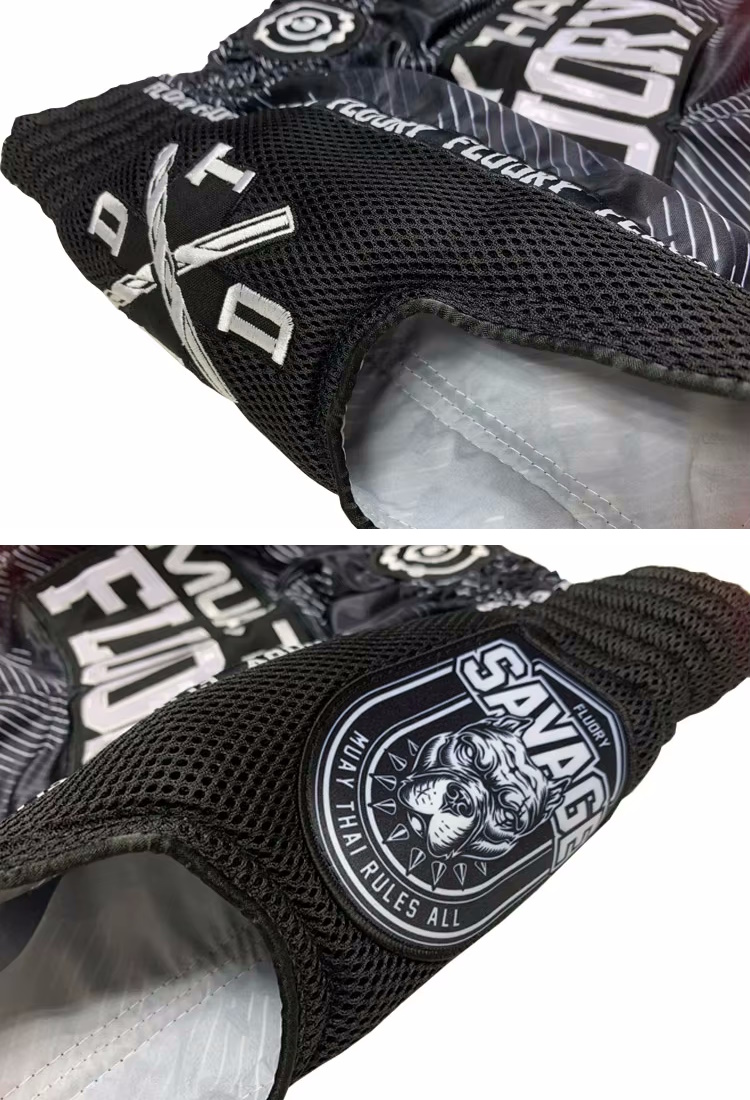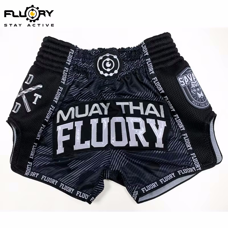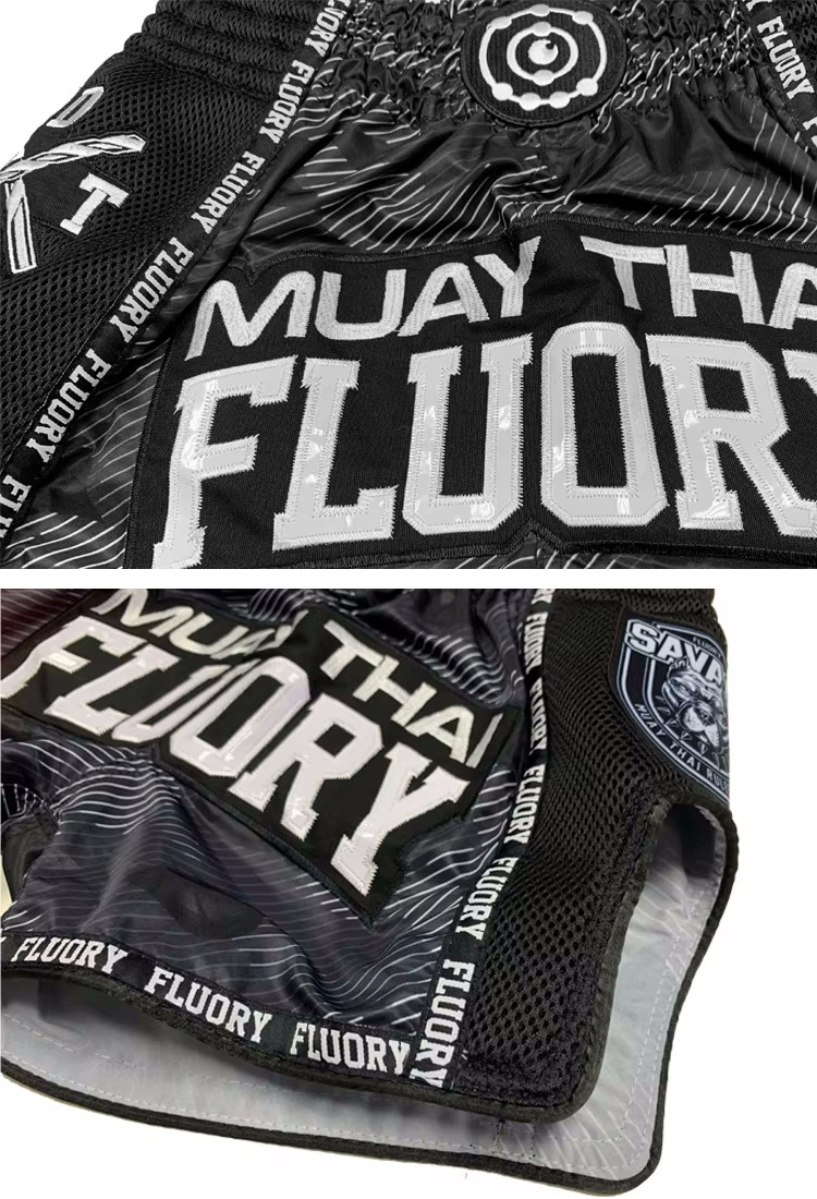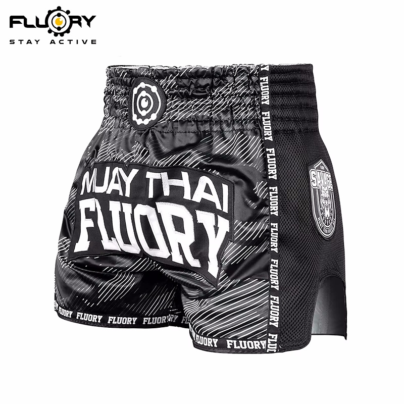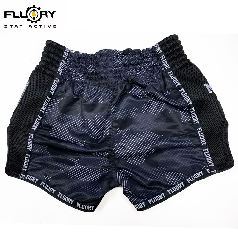 Тайские шорты FLUORY "SAVAGE" черного цвета в стильном камуфляжном дизайне. Шорты прочные и комфортные, обеспечат бойца необходимой мобильностью во время тренинга и турниров.